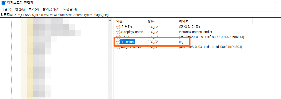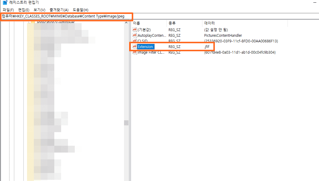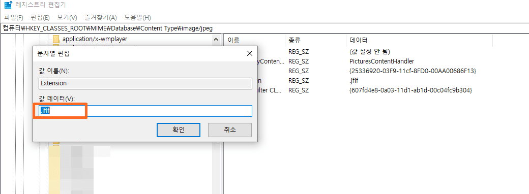 3. 아래와 같이 값 데이터에. jfif로 입력이 되어있는 것을 확인하실 수 있습니다.