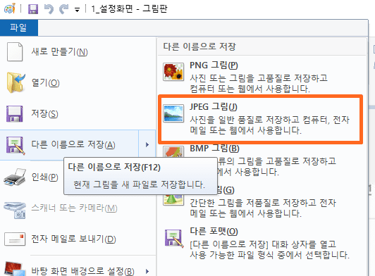 3. 파일 > 다른 이름으로 저장 > 'JPEG 사진 그림' 선택해주세요.