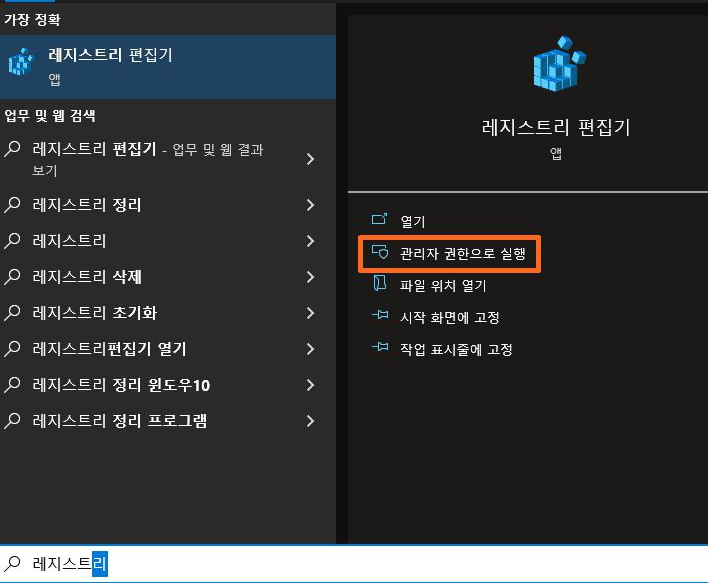 1. WINDOW 검색을 통해서 "레지스트리"를 검색하신 후 우측에 있는 [관리자 권한으로 실행] 버튼을 선택해주세요.